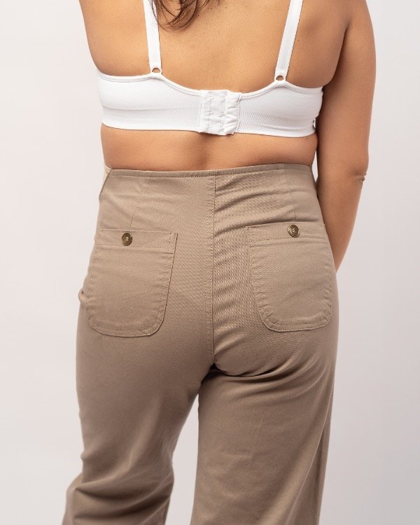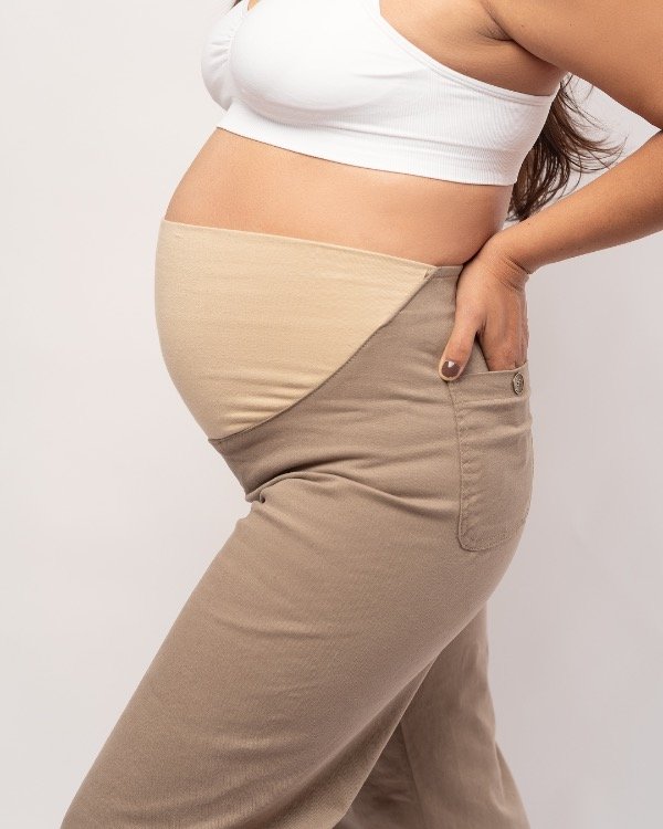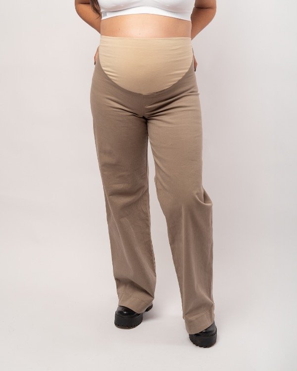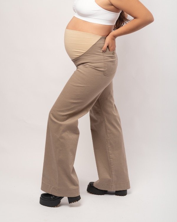 Pantalón de gabardina con faja maternal delantera, ligeramente entallado en la cintura, con efecto acampanado.